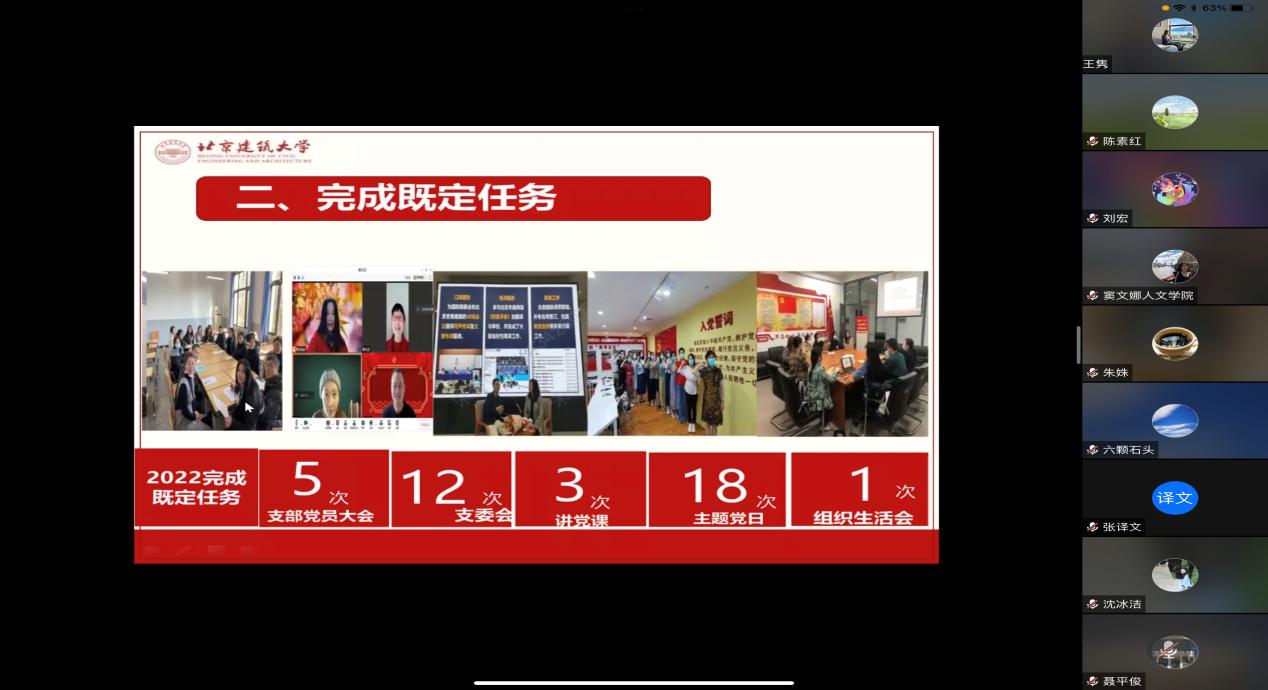 12月22日上午10点,外语部全体党员通过腾讯会议召开了支部党员大会,支部书记孙华代表党支部总结本学期党支部工作和对下学期工作展望。与会者积极发言讨论,会议气氛热烈。本学期支部完成了既定的“三会一课”、主题党日等活动。党员们回忆起结合学习宣传贯彻党的二十大精神,以主讲主问形式举行的“为党育人,为国育才,与建大同行——教学相长青年教师职业发展规划”主题党日活动,仍津津乐道,回味无穷。党员们在听取本学期支部工作总结后,纷纷表示要发挥先锋模范作用,有序做好本学期期末监考、阅卷等各项工作,同时以十足的信心和干劲全身心投入下学期各项准备工作。