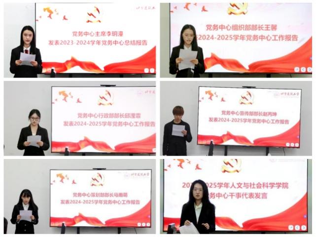 党务中心主要负责人李玥潼、组织部部长王馨、行政部部长邱滢霏、宣传部部长赵丙坤、策划部部长马雨萌及学生干事代表向大会做2023-2024学年工作总结。