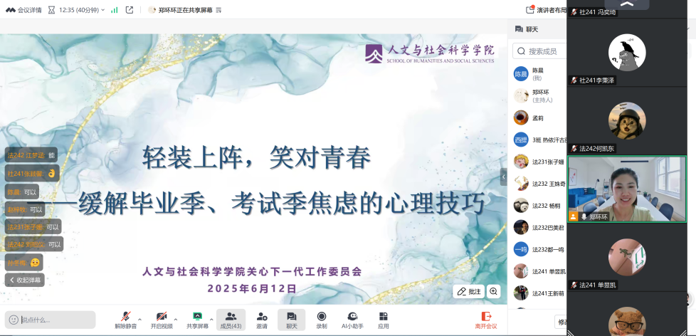 毕业季与考试季双重压力叠加,如何为学子心灵“松绑”?6月12日,催眠小说 关心下一代工作委员会精心策划,特邀学院退休教师、资深心理学专家孟莉副教授举办“轻装上阵,笑对青春”心理专题讲座。这位社会工作系原主任、中国心理学会临床心理学注册工作委员会首批督导师,退休后依然心系学子,以其深厚的专业积淀,为同学们奉上了一场解压“及时雨”。党委书记孙冬梅、团委书记陈晨及五十多名学生参加了活动,活动由学院关工委委员、组织员郑环环主持。