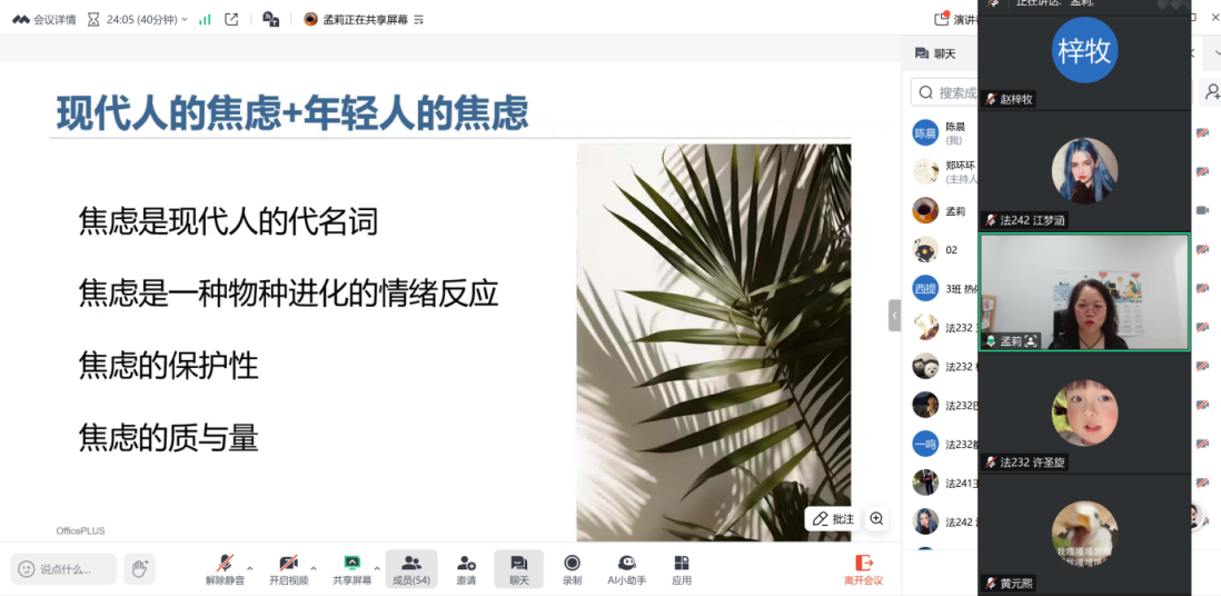 讲座中,孟莉老师发挥专业所长,精准把脉学生心理。她结合生动案例,首先解析了考试焦虑的成因与应对。她指出,各类重大考试后需要有心态调整期,而大学生更应主动培养健康考试观:合理规划时间,既不“压力山大”,也不“躺平”懈怠。