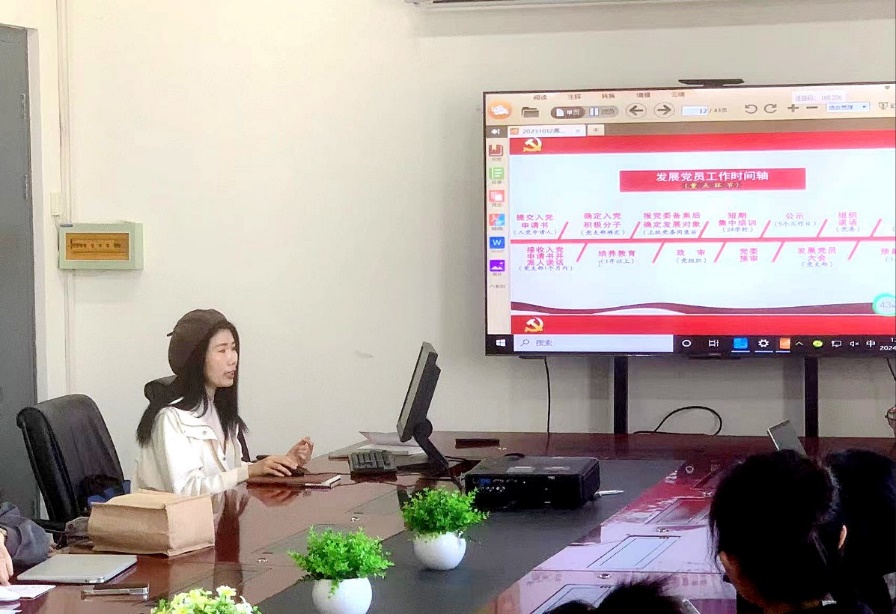 培训会上,郑环环围绕近期推选入党积极分子和发展对象的重点任务,阐述了党支部在此项工作中的核心步骤及需关注的要点,依据《中国共产党发展党员工作细则》、《中国共产党普通高等学校基层组织工作条例》、《北京高校党建和思想政治工作基本标准》以及北京市委教工委的相关指导要求,对党员发展的流程、关键环节、材料填写规范、审查步骤等多个方面进行了详尽的解读。最后,她就实际工作中可能遇到的问题进行了答疑解惑,确保每位支部委员都能全面理解并熟练掌握培训内容。