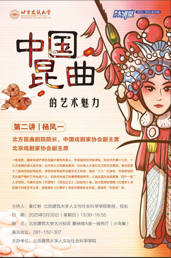 昆曲,作为中国现存最古老的戏曲艺术,2001年被联合国教科文组织列入首批“人类口头和非物质文化遗产”,本次课程的主讲人杨凤一先生作为国家级代表传承人对昆曲这门艺术有着自己独特的见解。这次,她将通过讲述、解说示范等形式,向听众详细讲述昆曲的历史发展渊源,同时,从文学、音乐、表演等美学角度上教会听众如何在现今这样一个浮华的物质社会中静心地体会昆曲之美,以期达到提升听众对于中国传统文化、古典文学和表演艺术的鉴赏力的目的。
