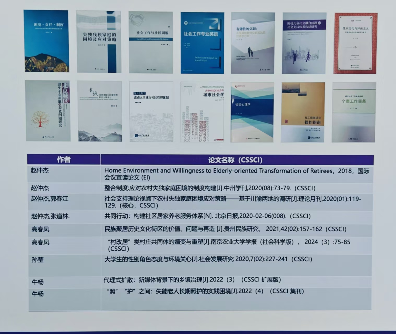 目前,已主持并完成国家社科基金项目一项、北京市社科基金项目一项、其他省部级、校级科研课题十一项。出版专著《北京城区独生子女家庭的养老问题研究》《困境.责任.制度:我国农村失独家庭的社会保障和社会支持研究》《社会工作与社区调解》《失独残独家庭的困境及应对策略》四部;合著《费孝通评传》(第1-6章)《十七大精神深度解读.文化建设篇》(第2章)马克思主义基础理论丛书《和谐社会观》(第11章)《城市社会学》(第5-7章)《社会工作服务项目申请及操作》(主编)五部,出版《社会工作专业英语》(中国人民大学出版社出版)专业教材一部,发表学术论文数十篇。