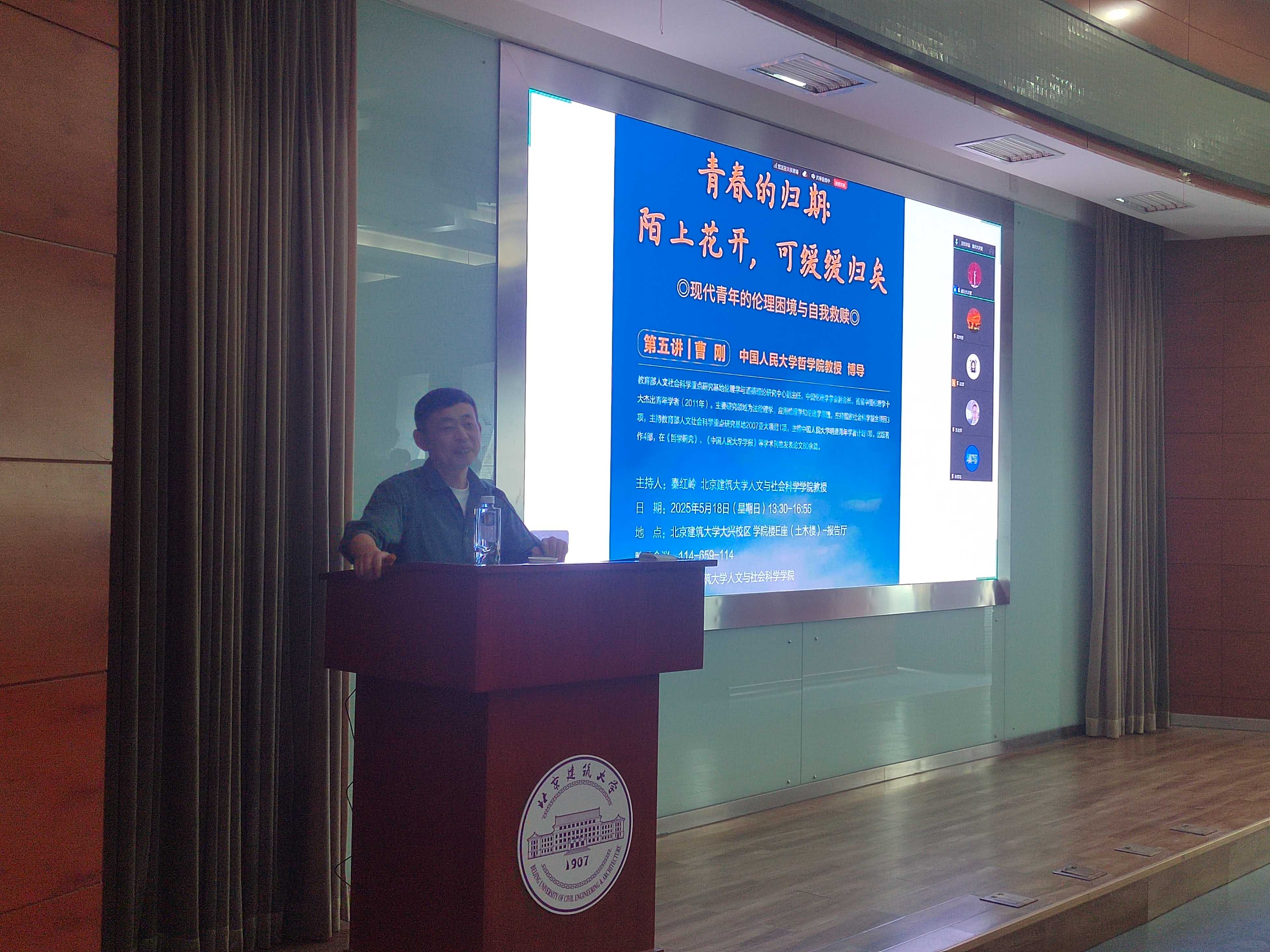 2025年5月18日,由催眠小说 主办的通识大讲堂第47讲在大兴校区举行。中国人民大学哲学院教授、教育部人文社会科学重点研究基地伦理学与道德理论研究中心主任曹刚作题为《青春的归期:陌上花开,可缓缓归矣》的专题讲座。讲座由催眠小说 秦红岭教授主持,吸引了线上线下400余位师生参与和交流。