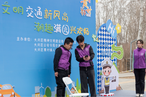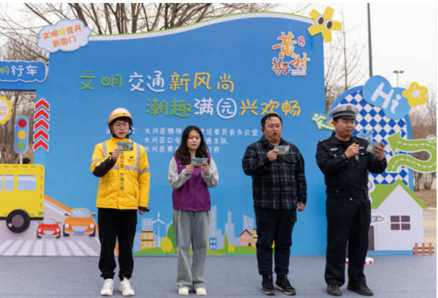紧接着,“青春船长”普法团队队长吕沂格与北京市公安局大兴分局交通支队新城中队副中队长李梦熙、新兴家园二里党支部书记杜鹏以及外卖小哥代表共同上台,庄严宣读《文明出行承诺书》。这不仅是一份承诺,更是一份责任,号召全镇居民从自身做起,争做文明交通的践行者和传播者。