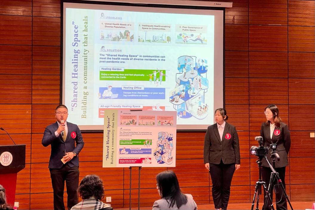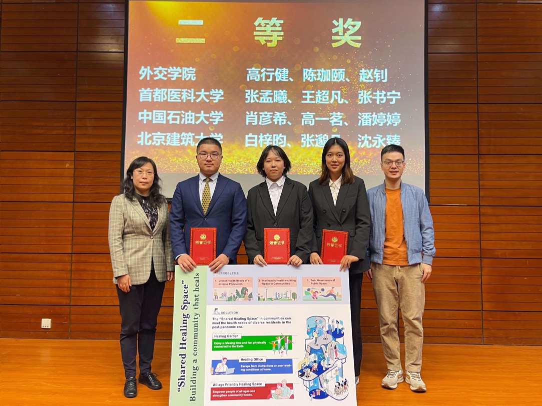 本届大赛主题为“Innovative Strategies for the Post-Pandemic Era”(后疫情时代的创新对策),下设与教育、健康、性别平等、生物多样性、就业和数字生活相关的6个分议题。我校代表队选择“疗愈型社区”作为提案主题,针对后疫情时代如何提升社区健康功能这一问题提出解决方案,并用英语撰写提案、制作精美电子海报,最终晋级决赛。