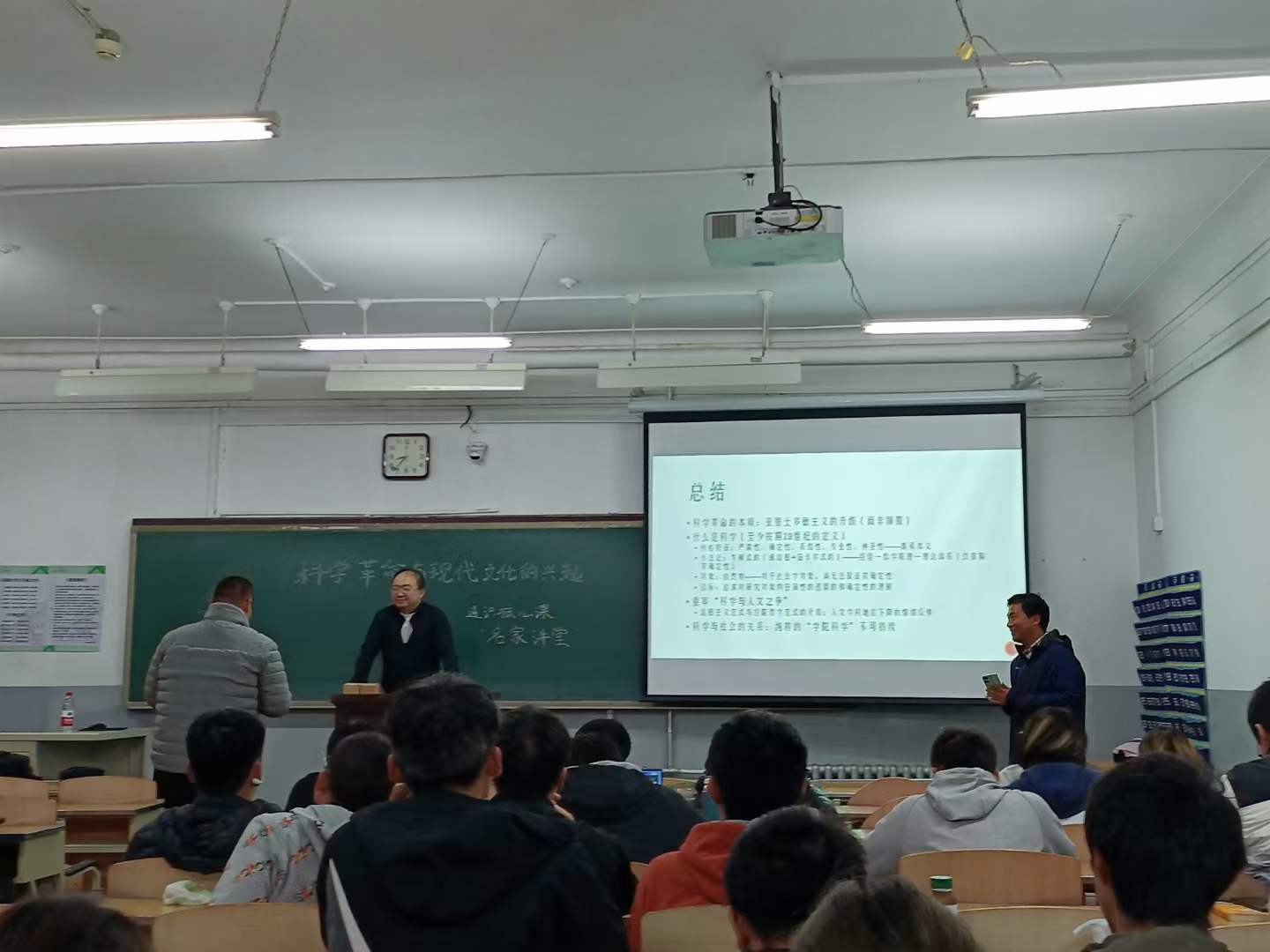 在两个多小时的讲座里,苏老师对“科学革命”的概念进行了溯源,讨论科学史家们如何建构起现在意义上的“科学革命”。他从古希腊的柏拉图、亚里士多德等哲学家的思想和影响,讲到希腊化时代,希腊先贤的思想向阿拉伯世界的传播,讲到文艺复兴后达芬奇、哥白尼、伽利略、牛顿、笛卡尔、培根等人的贡献,列举了天文学、医学、化学、物理学等领域的“革命”。他指出科学是渐进的,常规科学就是解决难题,当难题繁琐到难以解决时,就可能引起研究“方式”的转变,就是所谓的革命。