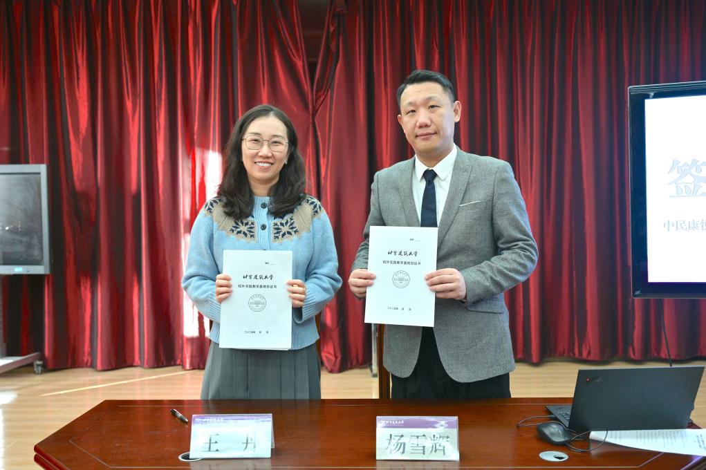 之后,王丹和杨雪辉代表双方签署合作协议,双方代表共同为实践教学基地揭牌。该实践教学基地的建立,将推动康养产业与高等教育深度融合,为养老服务提质升级、康养科技创新注入新动力。