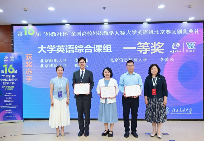 “外教社杯”全国高校外语教学大赛是目前国内外语教学领域最具影响力的赛事之一,旨在贯彻落实全国和北京市教育大会精神,推动高校外语课程改革与教学创新,提升外语教师的专业能力和教学水平。北京赛区赛事由北京市教育委员会高等教育处指导,北京市高等教育学会与上海外语教育出版社主办。大赛分为初赛、复赛和决赛三个阶段,初赛由各高校自行组织选拔,复赛采用线上形式,决赛则于北京市高校集中举行,采用现场命题与限时备赛的形式,全面考察教师的教学设计能力与现场表达能力。