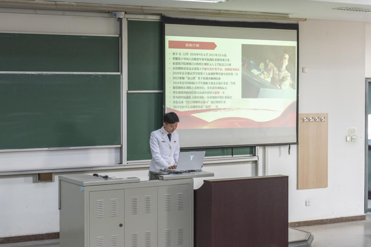 退役大学生士兵张宇将自身经历凝练为“我的兵之初”“蜕变”“光荣在于平淡”“若有战,召必回”四个阶段,向同学们分享了她在校和服役期间的经历。当兵是她从小到大的梦想,因此在踏入军营时,她心中满怀着热情与期待。初入部队,高强度的训练使她面临体能、心理等多方面的挑战,凭借着坚定的信念和踏实肯干的作风,最终她成功克服难关,逐渐适应部队的生活,并在不断的自我成长中领悟到参军入伍的意义。正如主题所言,光荣在于平淡,艰巨在于漫长,这些经历让她深刻体会到军人的责任与担当,回到学校后,她继续发扬在部队的优良传统,不怕吃苦,敢于斗争,她说自己不仅要做一个最好的兵,更要成为最好的自己。最后,她以真诚的语气鼓励同学们投身军旅,为国防事业做出贡献。