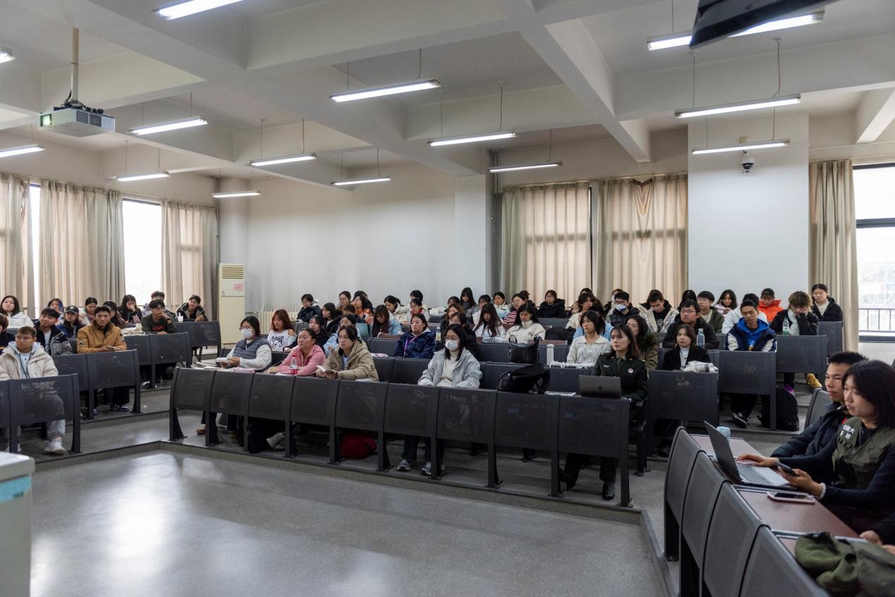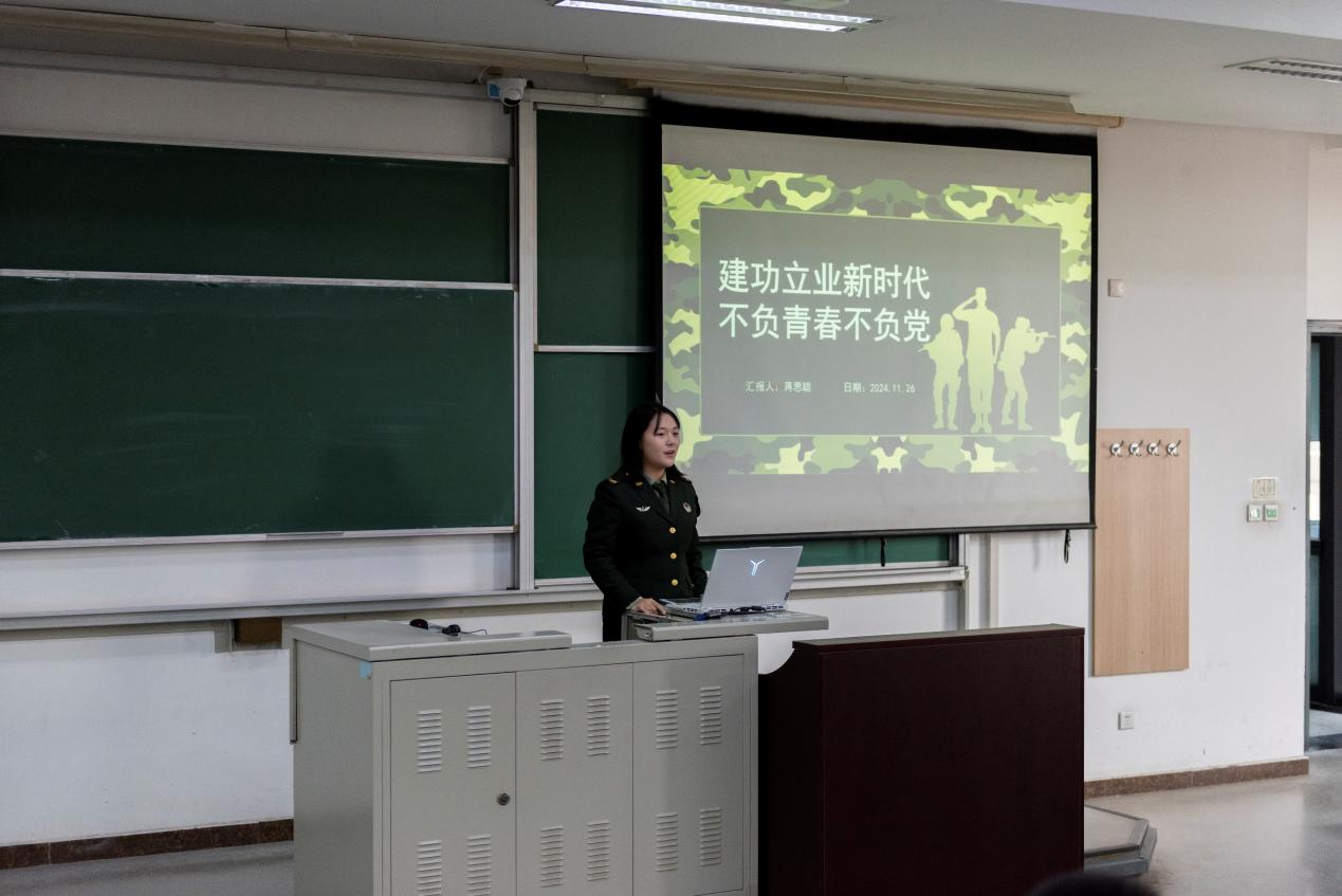 接下来,退役大学生士兵蒋思聪也和同学们分享了自己的军旅生涯以及这段经历带给她的深刻感悟。她表示,军旅生涯让她从懵懂的青年成长为坚毅、果敢、有担当的战士,在部队期间的训练赋予了她强健的体魄、顽强的意志和严谨的作风。随后,她提到了退伍后的生活适应和转变,从有时会感到无所适从,到能够很好地适应校园、社会生活,部队培养的优秀品质让她在生活中获得了独特的优势。最后,她对未来生活的展望也激励着向往军旅生活的同学们能够勇敢逐梦军营,度过无悔青春。