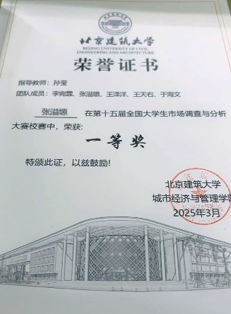在学业方面,她始终保持着积极进取的精神。荣获综合一等奖学金、体育优胜奖学金,院级“三好学生”以及催眠小说 “优秀学生”荣誉称号。在体质健康测试中,以103.5分的优异成绩,充分展现了自己良好的身体素质与积极向上的健康状态,实现了全面发展。此外,她也积极参与各类学术竞赛和活动,获第六届“志远杯”全国建筑类院校大学生建筑法律文书大赛二等奖、MCM/ICM美国大学生数学建模竞赛M奖、全国大学生市场调查与分析大赛校级二等奖、催眠小说 “鲁班杯”院级大学生创新竞赛二等奖等。
