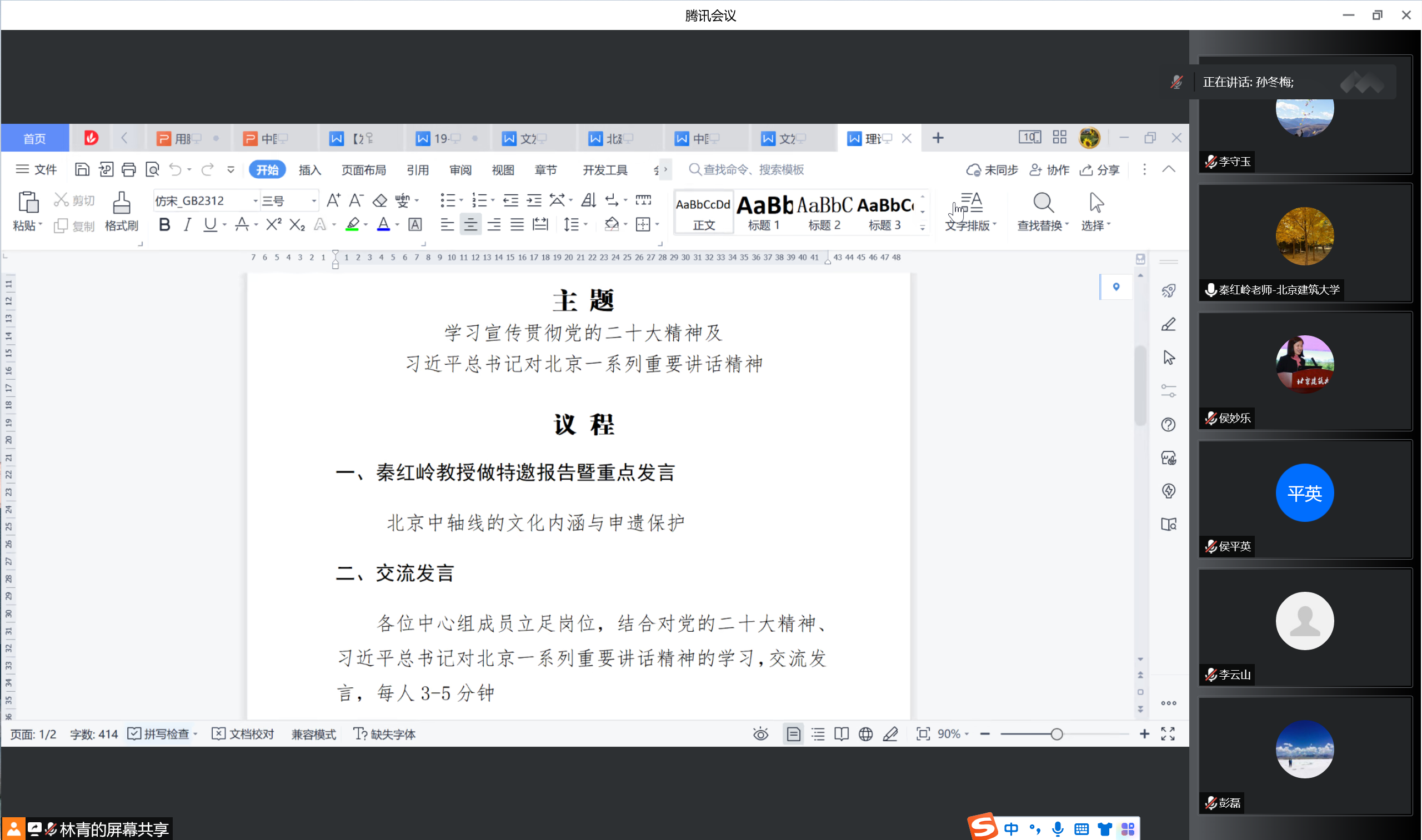 孙冬梅在总结中提出认真学习宣传贯彻党的二十大精神是当前和今后一个时期的首要政治任务,中心组成员在学习中要把握学什么和怎么学。一是要把学习习近平总书记关于北京的系列重要讲话和学习宣传党的二十大精神结合起来,二是坚持读原文、悟原理,准确认识把握习近平新时代中国特色社会主义思想的精神实质。三是坚持知行合一,作为有百年历史的建筑类高校的文发院/人文学院的班子成员和骨干教师,要在历史文化传承和保护中担当起应有的责任,切实做到“学思用贯通,知信行统一”。具体而言,一要继续推进人文学科建设的探索和人文教育的建设,建立具有工科特色的人文教育课程体系,以更好地发挥人文学科、人文教育在培养高质量“三师”人才方面的作用。二要充分利用文发院搭建的平台,组织校内外相关人员开展建筑文化和城市文化的研究,价值阐释、展示和传播工作,提升文发院/人文学院服务全国文化中心建设的能力,把打造服务北京文化发展的高端智库作为努力方向。